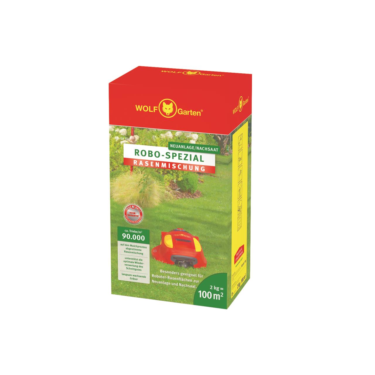 Besonders geeignet für Robotergemähte Rasenflächen zur Neu-Anlage und Nachsaat. Die Wolf Garten ROBO-Spezial Rasenmischung ist der ideale Gebrauchsrasen für die Pflege mit automatischen Mährobotern und Mulchmähern. Diese Qualitäts-Rasenmischung mit schnellkeimenden, kurzwüchsigen Sorten sorgt für dichtes Wachstum und Belastbarkeit. Geringer Zuwachs, wenig Schnittgutabfall und Widerstandsfähigkeit zeichnen diese Rasensorte aus. Der ROBO-Spezial Rasensamen eignet sich sowohl zur Neuanlage von Rasenflächen als auch zur Nachsaat von schon vorhandenen Rasenflächen. Er bildet einen extrem dichten Rasen, verdrängt Unkräuter und ist besonders pflegeleicht. Speziell ausgewählte, langsam wachsende Gräsersorten ermöglichen, das Schnittgut auf der Rasenfläche zu belassen. Er zersetzt sich auf der Rasenfläche, ohne diese zu verfilzen und dient dazu noch als organischer Dünger. Flächen die mit dem Mähroboter gepflegt werden, haben sehr kurze, regelmäßige und wiederkehrende Schnittintervalle. Der ROBO-Spezial Rasensamen bildet hierfür eine extrem dichte Narbe und sorgt so für eine optimale Befahrbarkeit durch Robo-Mäher.